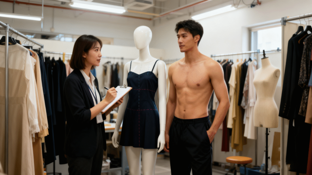 - Sample fitting: Produce 3~5 sample garments, invite target customers to try them on, and record size feedback (e.g., too narrow shoulder width, insufficient garment length).