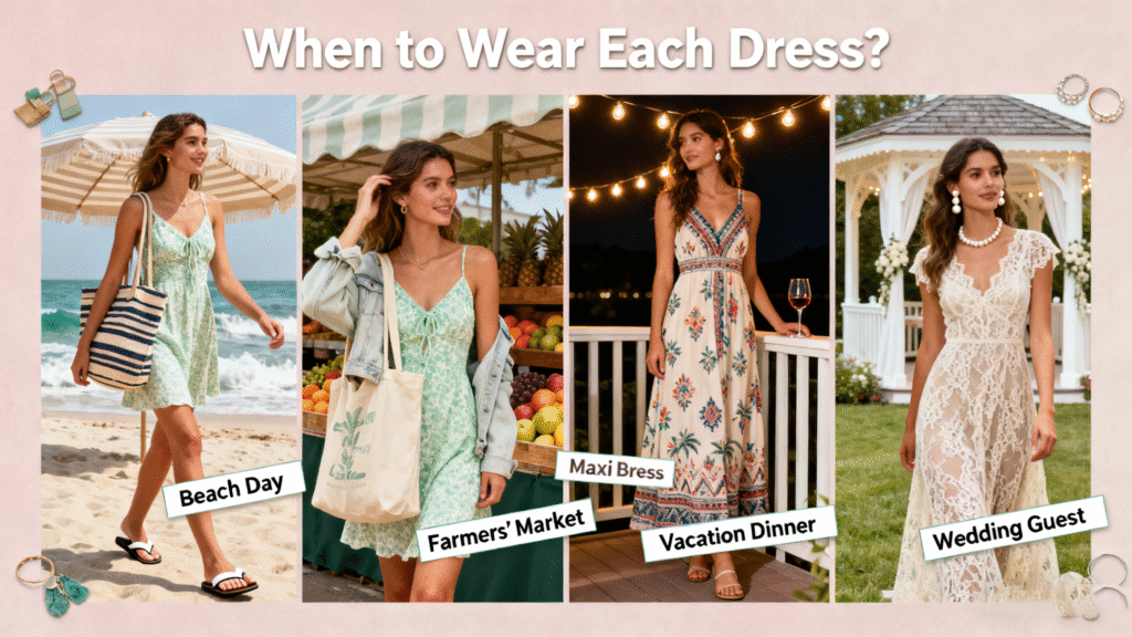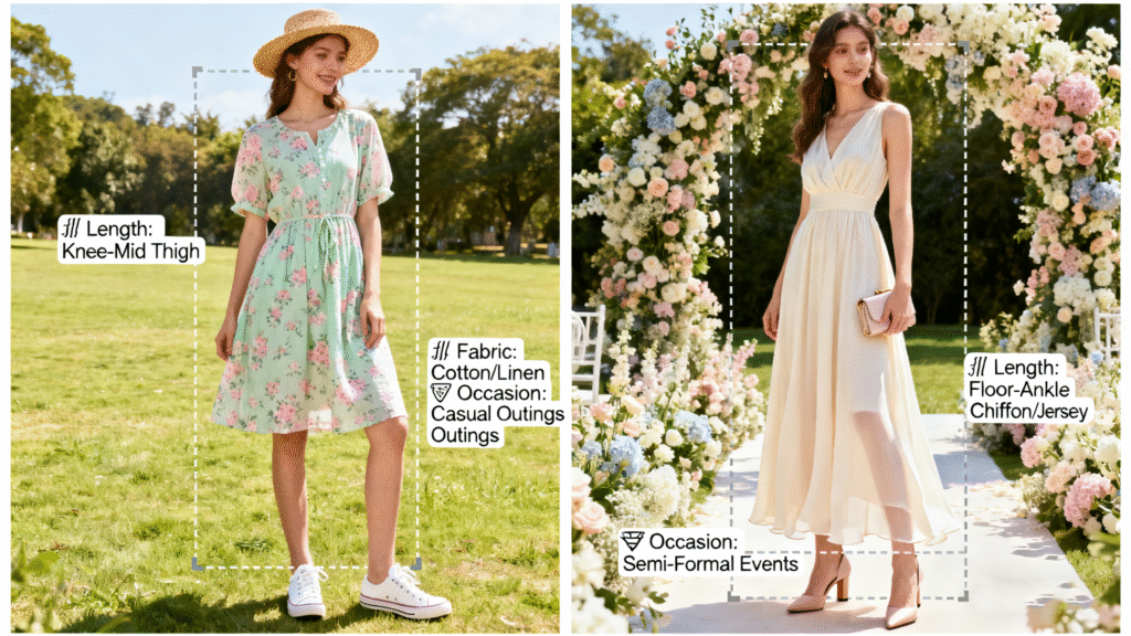 | Occasions | Casual outings, beach days, picnics, brunch | Semi-formal events, weddings, vacation dinners, evening walks |