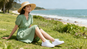 Summer: White sneakers (casual), nude sandals (dressy), or espadrilles (boho).
